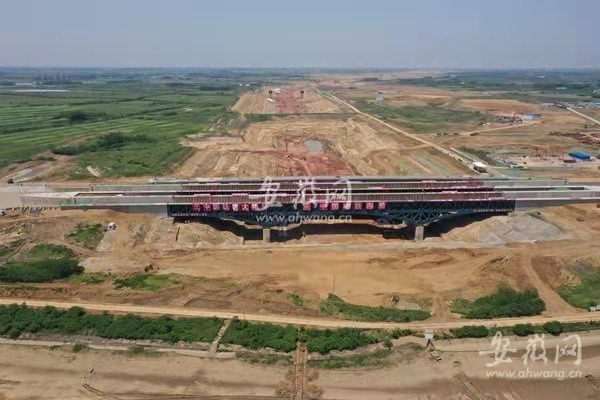 據(jù)介紹,淠河總干渠渡槽工程由中鐵四局和中國(guó)鐵建大橋局聯(lián)合承建,是引江濟(jì)淮重大節(jié)點(diǎn)工程。渡槽總長(zhǎng) 350 米,分左右兩幅,其中鋼渡槽全長(zhǎng)246 米,總用鋼量達(dá) 2.1 萬(wàn)噸。設(shè)計(jì)流量150立方米每秒,設(shè)計(jì)水深4.0米,為Ⅵ級(jí)航道,通行100噸級(jí)船舶。橋跨布置采用 68 米 +110米 +68 米的三跨鋼結(jié)構(gòu)桁架式梁拱組合設(shè)計(jì),主跨跨度達(dá) 110 米,是目前世界上單跨最大的通水通航鋼結(jié)構(gòu)渡槽。渡槽下部為引江濟(jì)淮Ⅱ級(jí)航道,兩航道高差約30米。
